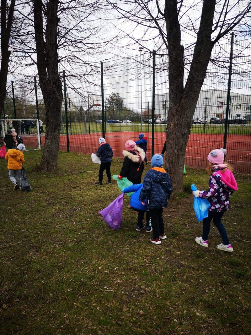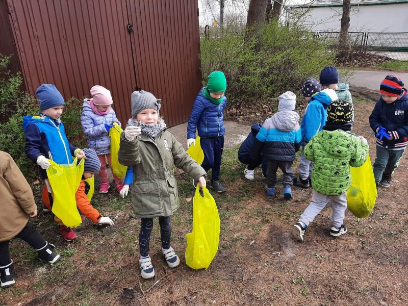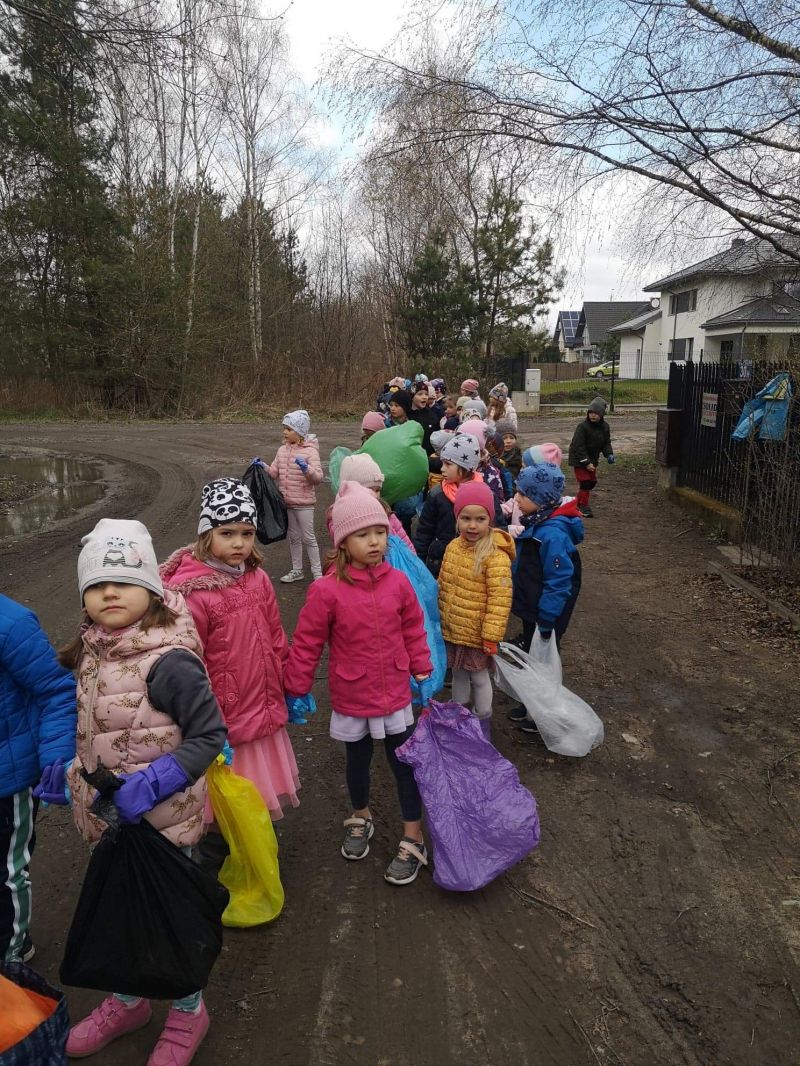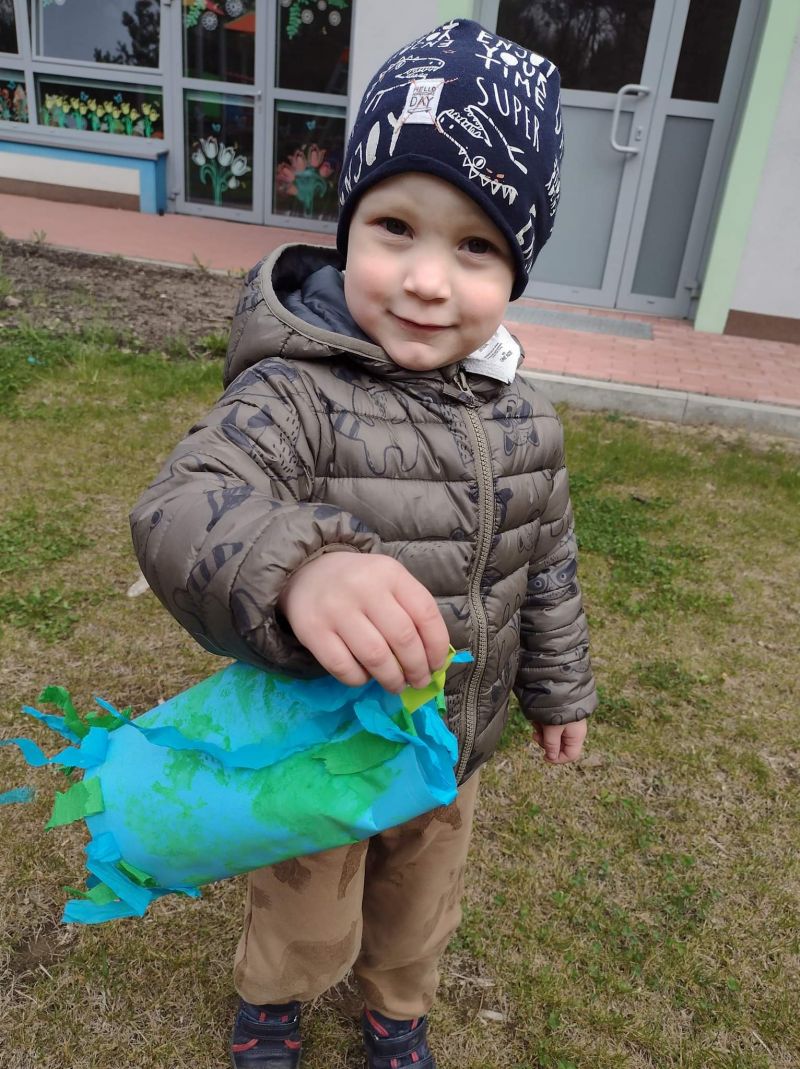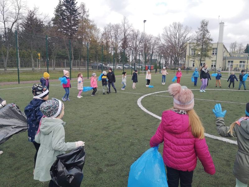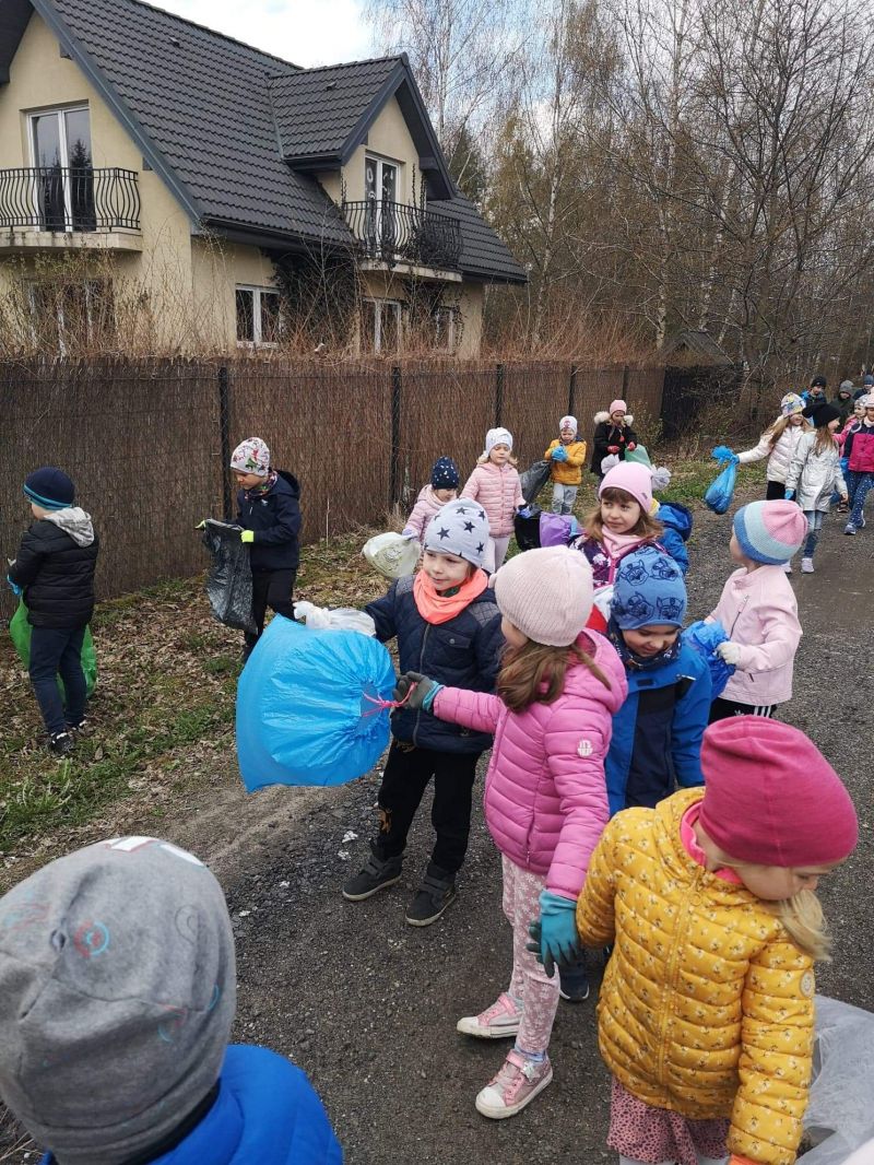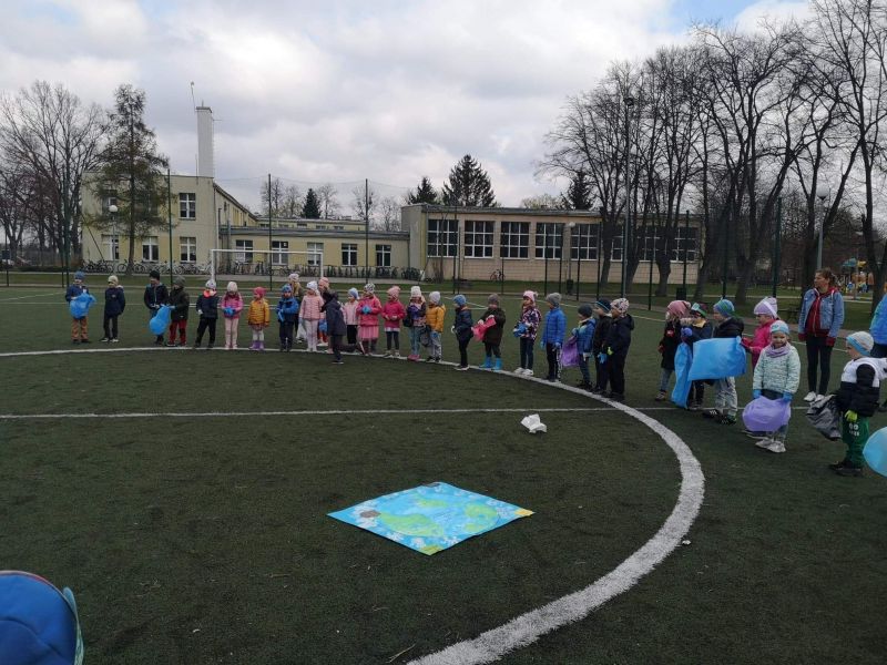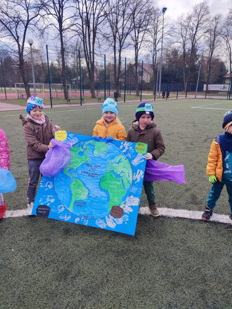 Światowy Dzień Ziemi dzieci świętowały radośnie. W czasie zajęć dydaktycznych przedszkolaki przypomniały sobie zdobyte już wcześniej informację ma temat ekologii - jak należy dbać o naszą planetę, na czym polega segregacja odpadów oraz zapoznały się z bardzo trudnym pojęciem recykling. Po krótkim wstępie dzieci wyruszyły na boisko, aby wspólnie zaśpiewać i zatańczyć "Eko Pingwinka", a następnie ruszyły na wielkie sprzątanie Ziemi. Najmłodsi dzielnie porządkowali teren wokół przedszkola, starszaki nazbierały góry śmieci idąc wzdłuż drogi. Każdy chętnie włączył się w akcję, łącząc przyjemne z pożytecznym. Na koniec zaśpiewaliśmy "Sto lat" dla Ziemi!