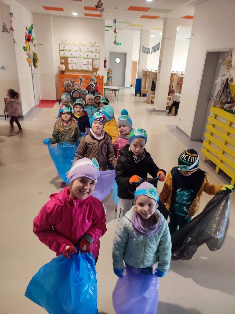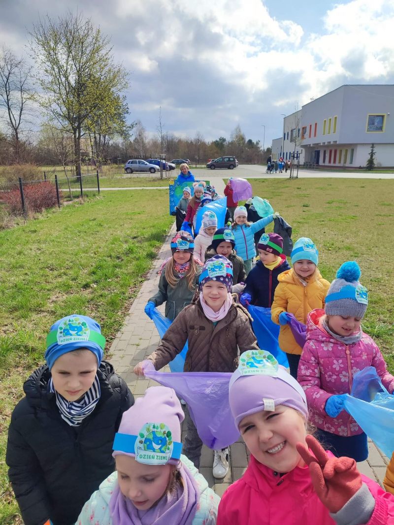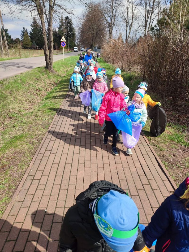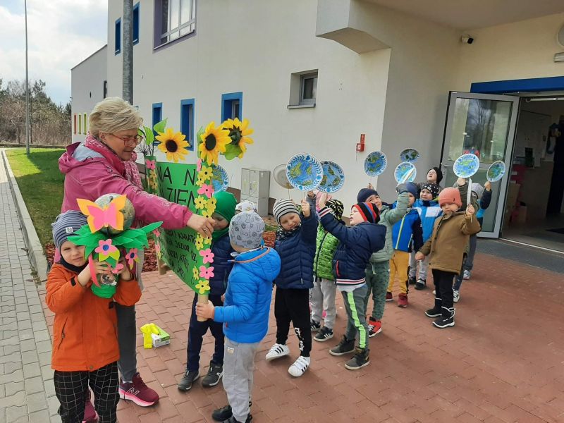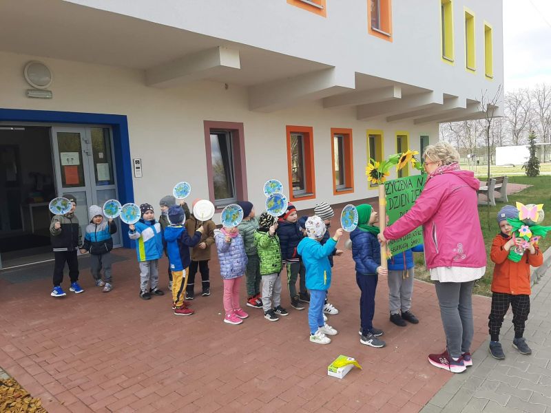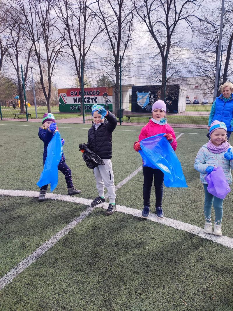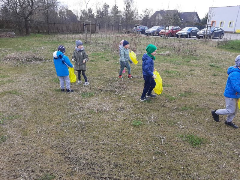 Światowy Dzień Ziemi dzieci świętowały radośnie. W czasie zajęć dydaktycznych przedszkolaki przypomniały sobie zdobyte już wcześniej informację ma temat ekologii - jak należy dbać o naszą planetę, na czym polega segregacja odpadów oraz zapoznały się z bardzo trudnym pojęciem recykling. Po krótkim wstępie dzieci wyruszyły na boisko, aby wspólnie zaśpiewać i zatańczyć "Eko Pingwinka", a następnie ruszyły na wielkie sprzątanie Ziemi. Najmłodsi dzielnie porządkowali teren wokół przedszkola, starszaki nazbierały góry śmieci idąc wzdłuż drogi. Każdy chętnie włączył się w akcję, łącząc przyjemne z pożytecznym. Na koniec zaśpiewaliśmy "Sto lat" dla Ziemi!