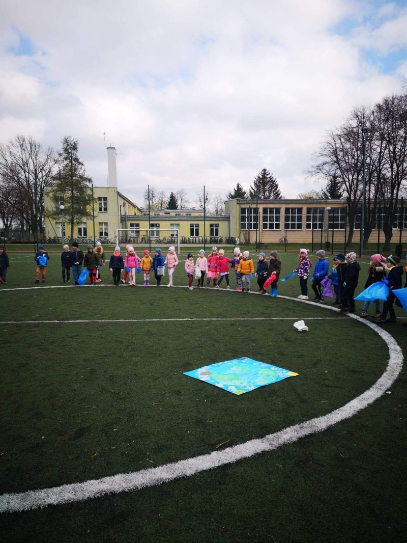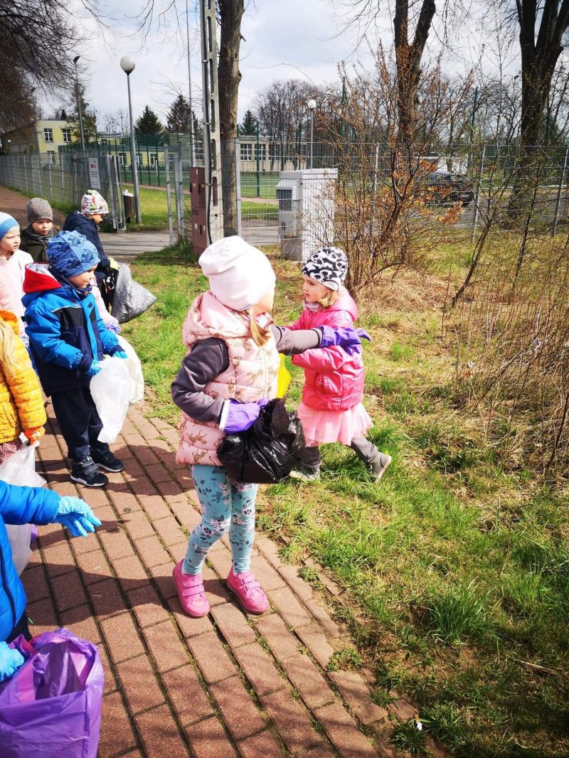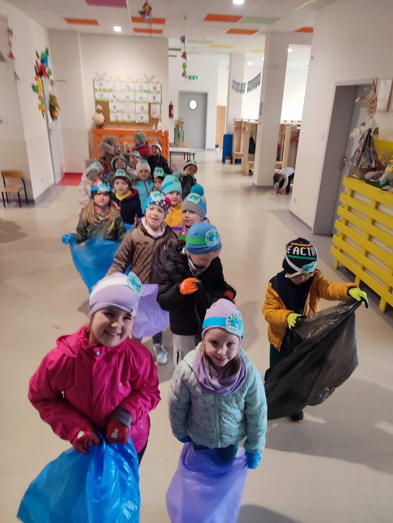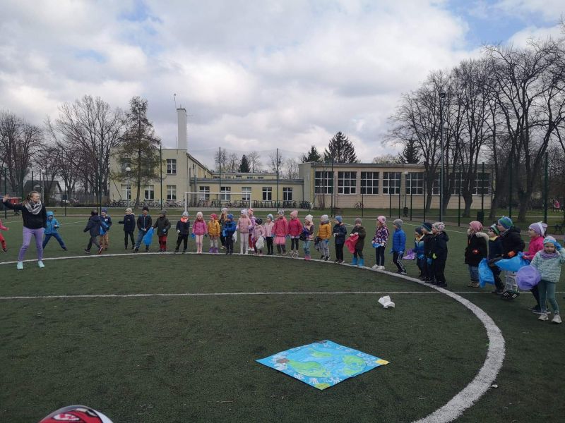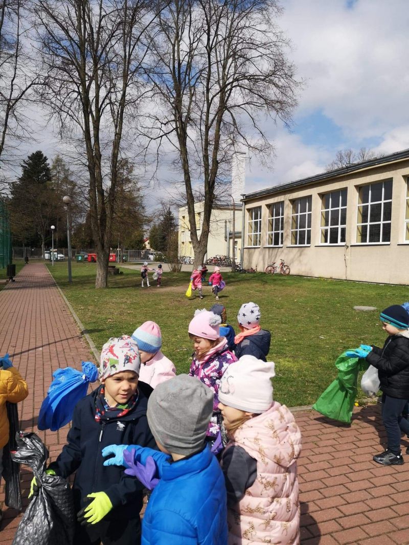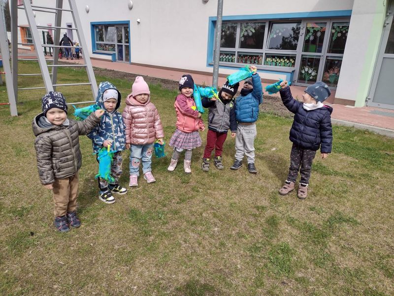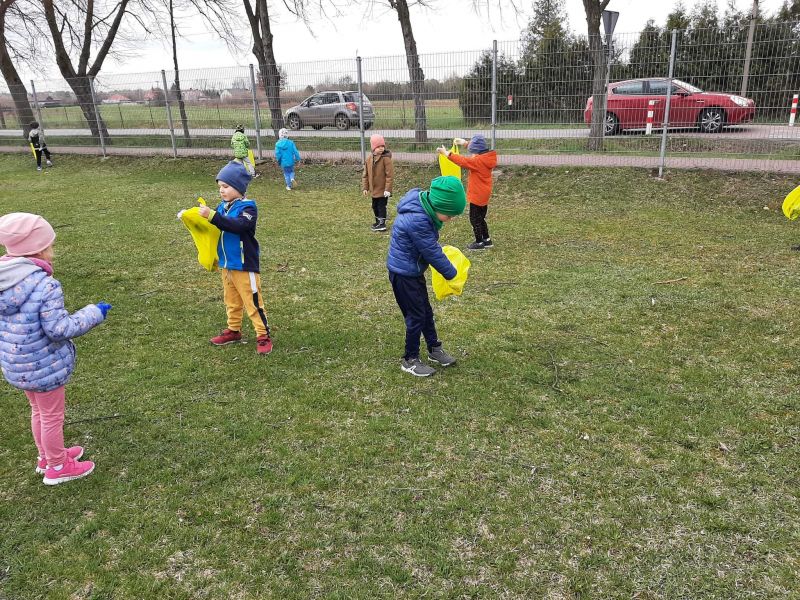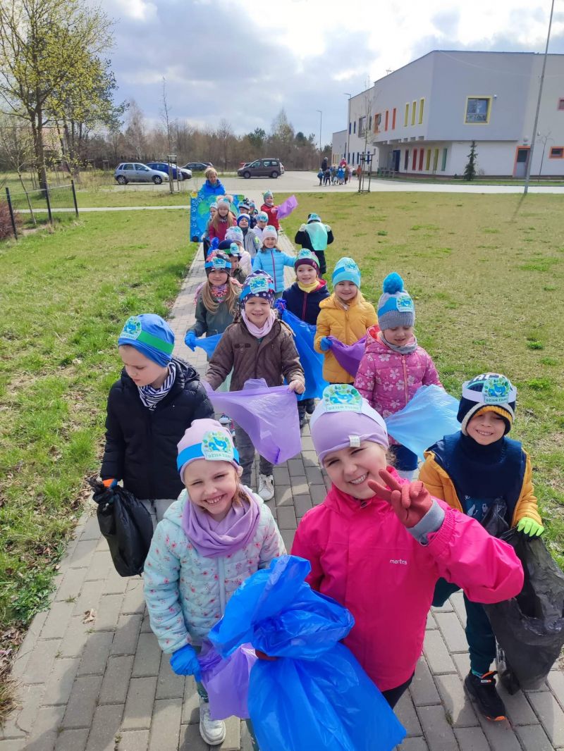 Światowy Dzień Ziemi dzieci świętowały radośnie. W czasie zajęć dydaktycznych przedszkolaki przypomniały sobie zdobyte już wcześniej informację ma temat ekologii - jak należy dbać o naszą planetę, na czym polega segregacja odpadów oraz zapoznały się z bardzo trudnym pojęciem recykling. Po krótkim wstępie dzieci wyruszyły na boisko, aby wspólnie zaśpiewać i zatańczyć "Eko Pingwinka", a następnie ruszyły na wielkie sprzątanie Ziemi. Najmłodsi dzielnie porządkowali teren wokół przedszkola, starszaki nazbierały góry śmieci idąc wzdłuż drogi. Każdy chętnie włączył się w akcję, łącząc przyjemne z pożytecznym. Na koniec zaśpiewaliśmy "Sto lat" dla Ziemi!