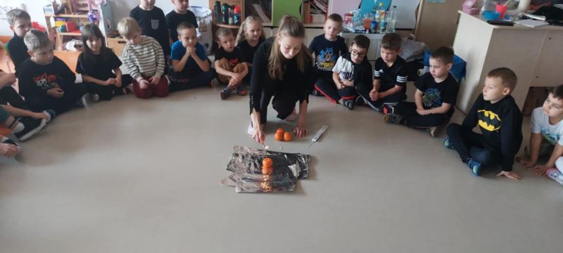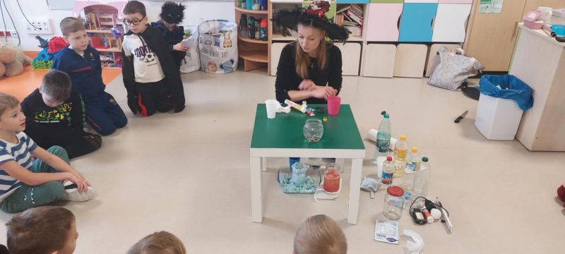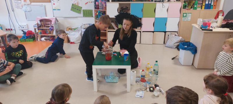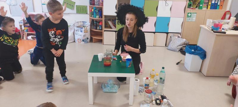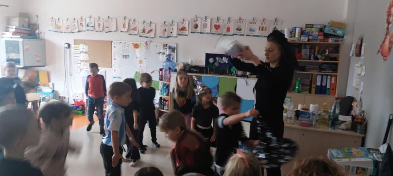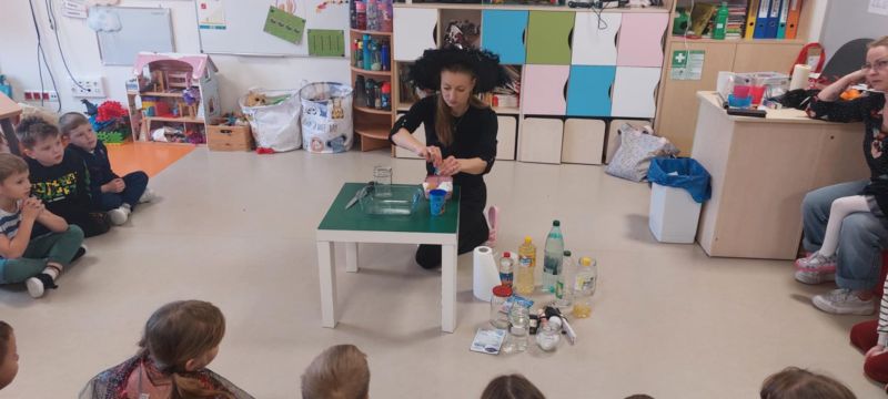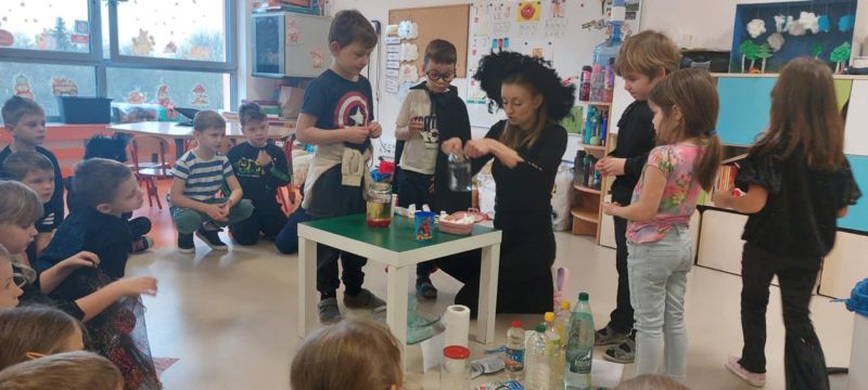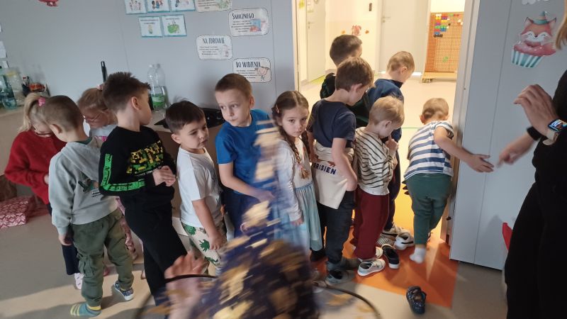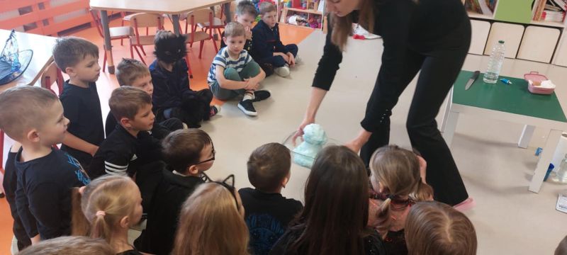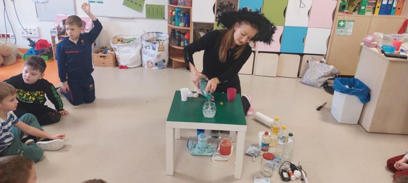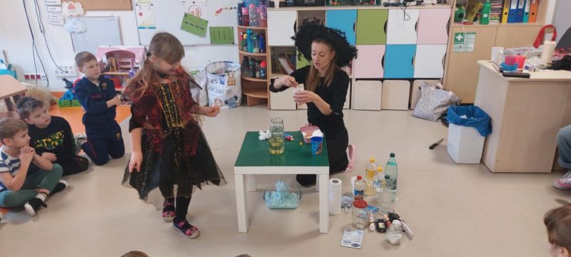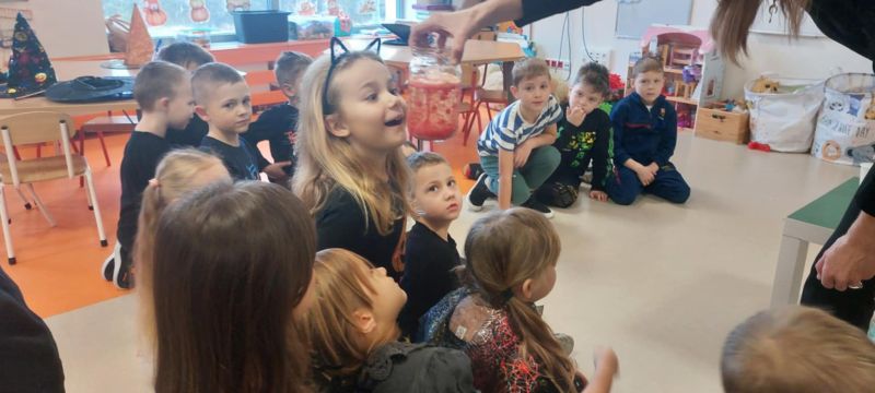 Dzieci wysłuchały opowieści o tradycjach andrzejkowych – skąd się wzięły oraz dlaczego dawniej ludzie wróżyli. W programie była również magiczna gimnastyka, a także wróżba z butami – sprawdzaliśmy, czyj but jako pierwszy „wyjdzie za drzwi”, czyli kto najszybciej wyruszy w daleką podróż. Najważniejszym punktem dnia były magiczne eksperymenty, które wzbudziły ogromny zachwyt. Dzieci z dużym zaangażowaniem brały w nich udział i chętnie odkrywały kolejne „czarodziejskie” niespodzianki.